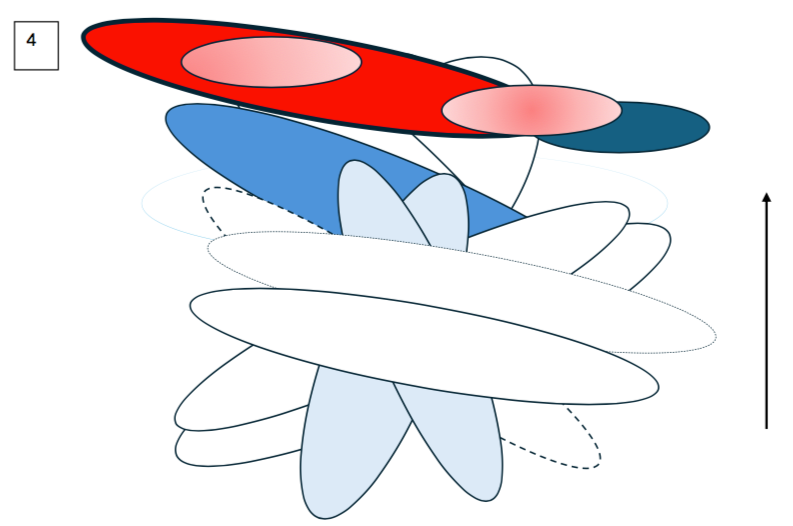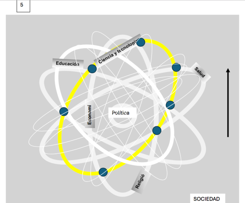 El último cuadro (5), cada circulo de color azul representa centros, puntos que se transforman en focos de sobreposición de las elipses, mostrando estas últimas, el flujo circular de la concepción ideológica aplicada, lo que naturalmente genera fricciones al sistema, gatillando nuevas ideas de mejora con la propia ejecución de la propuesta o flujo de la idea aplicada; la que tendrá la potencialidad de ocurrencia autónoma, en la medida que responda con eficiencia a las exigencias del entorno. La subordinación o coexistencia de las partes del entramado sistémico cruzará de forma natural sus límites, al abrirse a la generación de la respuesta eficiente y eficaz, la que en consonancia engendrará nuevos modelos, metamorfoseando el existente, de allí las líneas del costado de los cuadros que señalan la desintegración de la red Economíca. para reconstruir otra, diseño que hace recursivo el desarrollo de propuestas. Las denominadas aquí, elipses ejes, se irán turnando la conducción del modelo según el desenlace de situaciones vivenciales que se desprenderán del propio movimiento que conllevan sus resoluciones. Hoy vivimos la dirección de la cuerda presentada en color amarillo en advertencia de peligro con el avance eruptivo de la Ciencia y Tecnología, peligro como advertencia, pues cualquier decisión implica elegir que algo se mantenga y algo se descarte, por lo que se debe estar alerta a los frutos que germinen de esa decisión.